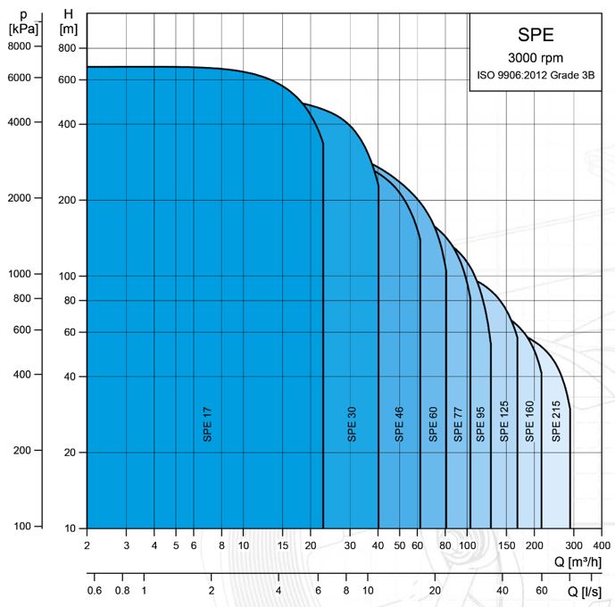 Grundfos предлагает широкий ассортимент энергоэффективных скважинных насосов SPE c производительностью от 10 до 280 м³/ч и мощностью двигателя до 45 кВт. Ассортимент cостоит из насосов типоразмеров от SPE 17 до SPE 215. Каждый размер насоса доступен с дополнительным количеством ступеней, чтобы соответствовать заданной рабочей точке.