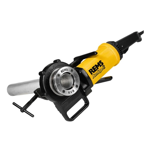 REMS Амиго 2 компакт. Электрический резьбонарезной клупп с быстрос- менными головками для трубной резьбы 1⁄8 – 2”, 16 – 50 мм, болтовой резьбы 6 – 30 мм, 1⁄4 – 1”. Для правой и левой резьбы. Привод, опорный бугель, не требующий технического обслуживания редуктор, надёжный, мощный, уни- версальный двигатель 230 В, 50–60 Гц, 1200 Вт., с увеличением мощности посредством автоматической перестановки угольных щёток.